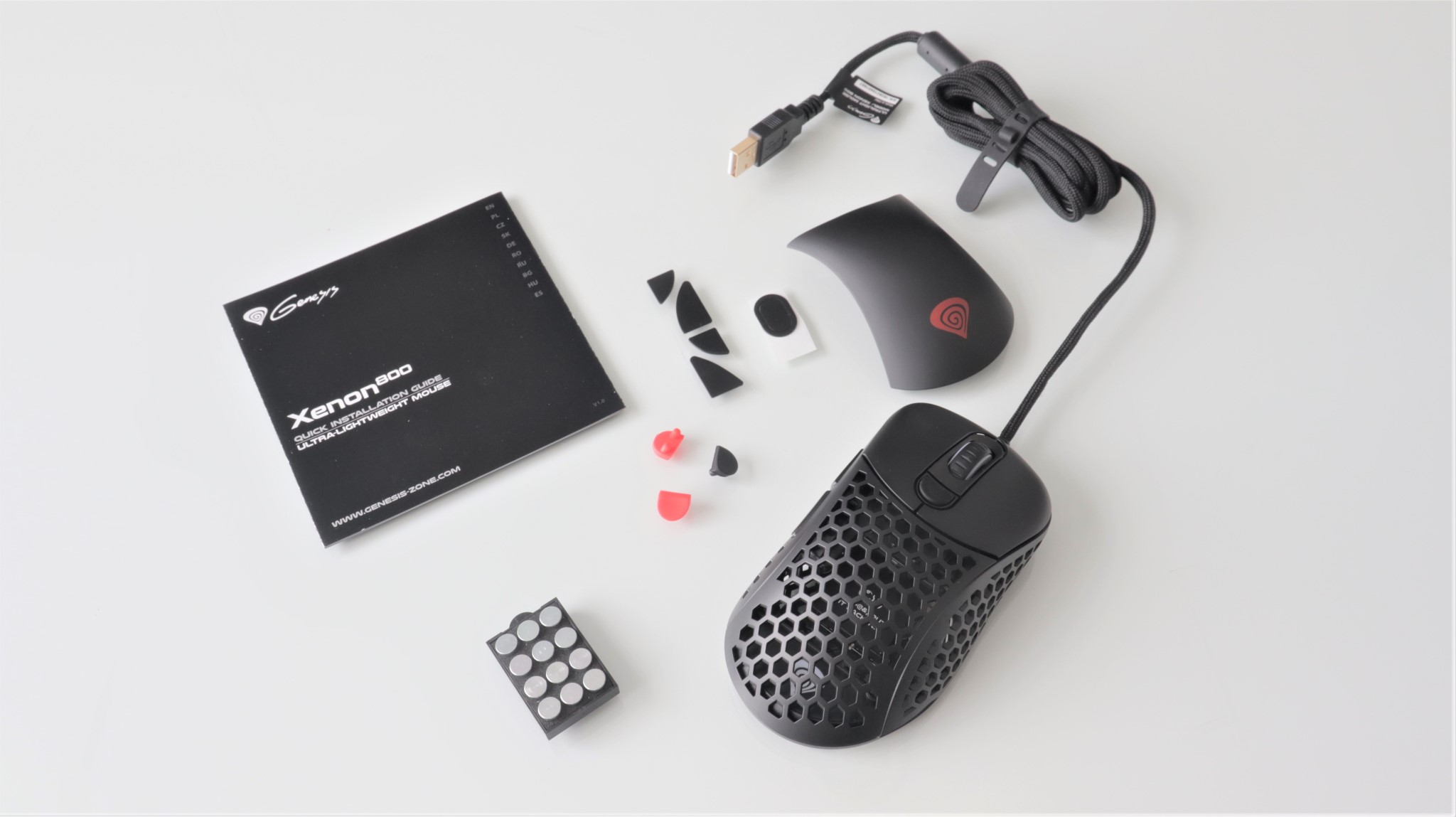 Mausul Genesis Xenon 800 l-am primit în cutia de retail sigilată, în care mai sunt câteva accesorii – butoane de schimb, capac superior, greutăți suplimentare într-o tăviță specială, 5 bucăți de teflon pentru zonele de contat ale mausului cu suprafața, plus un ghid de pornire rapidă.