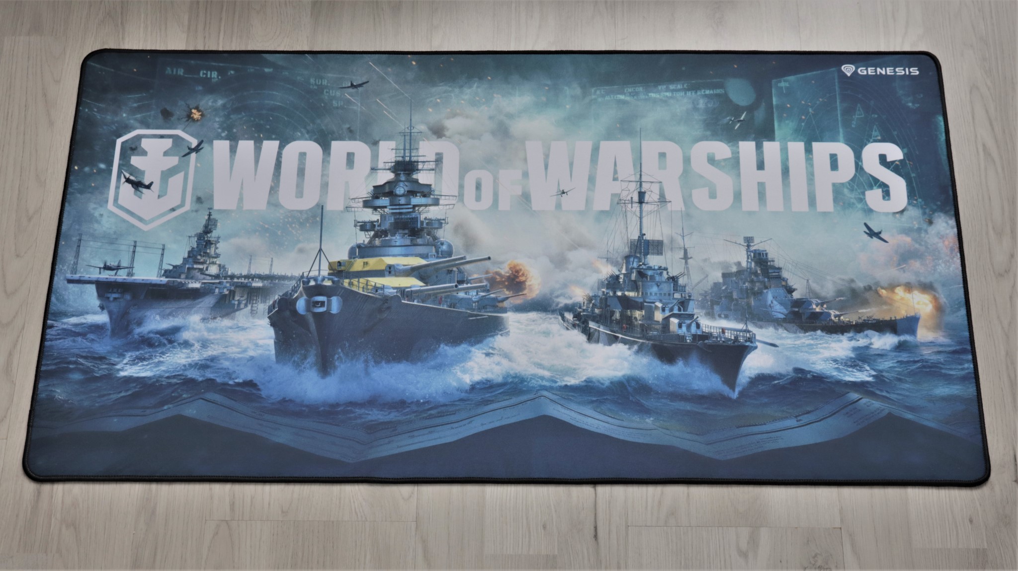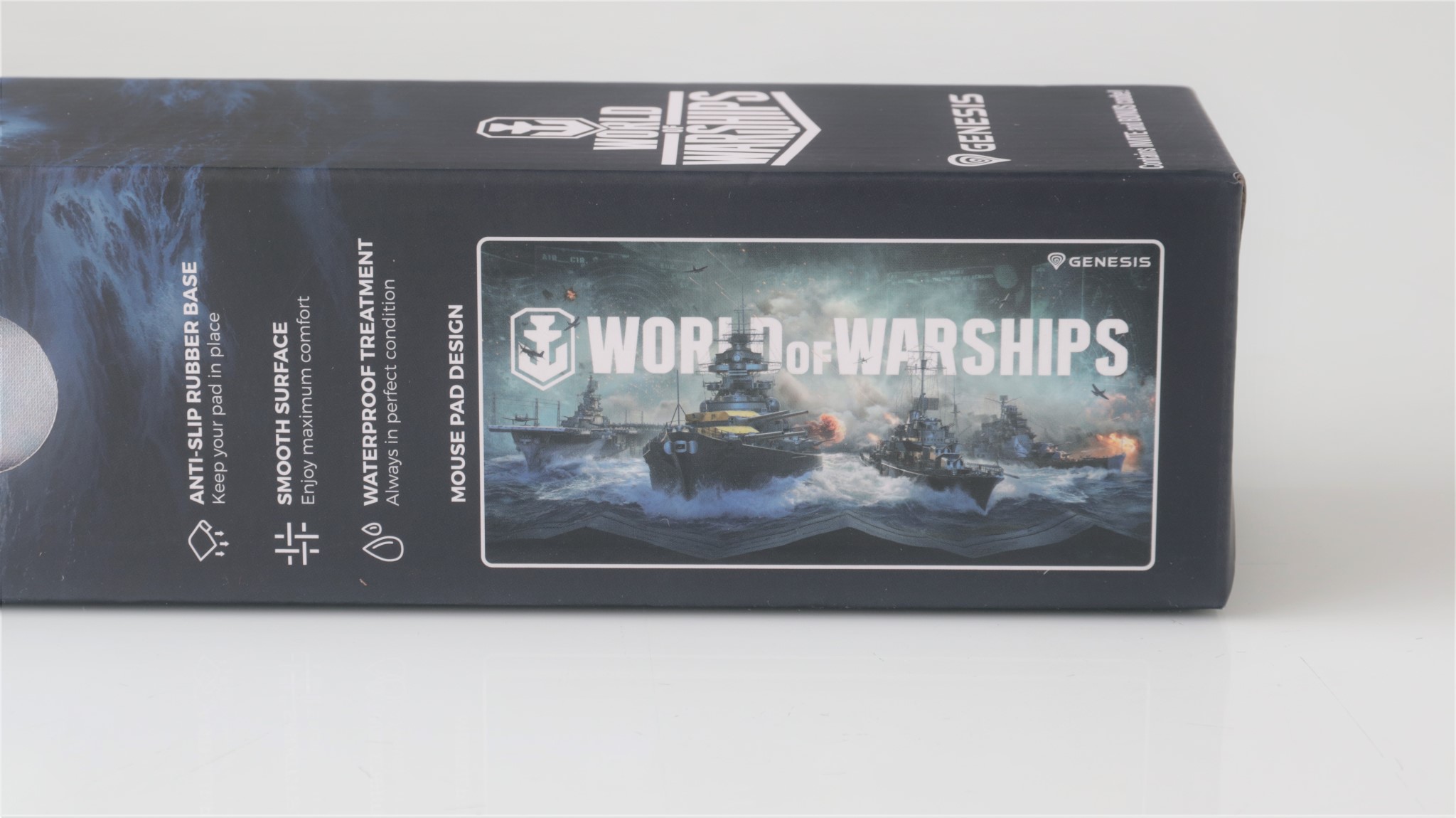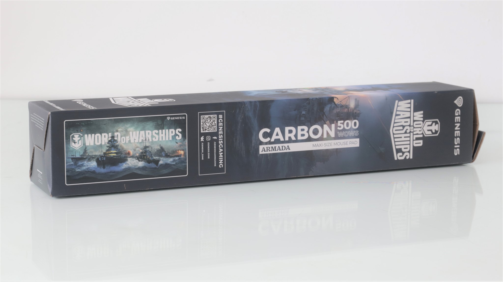 O să vă prezint mai întâi mauspad-ul Genesis Carbon 500 Maxi Armada, nefiind prea mult de povestit despre acesta. Vine în cutie fără altceva alături, cu un sticker aplicat pe spate pe care este scris un cod pentru jocul World Of Warships, mauspadul fiind o ediție dedicată acestuia, cu imaginea de pe partea frontală evocând acest titlu.