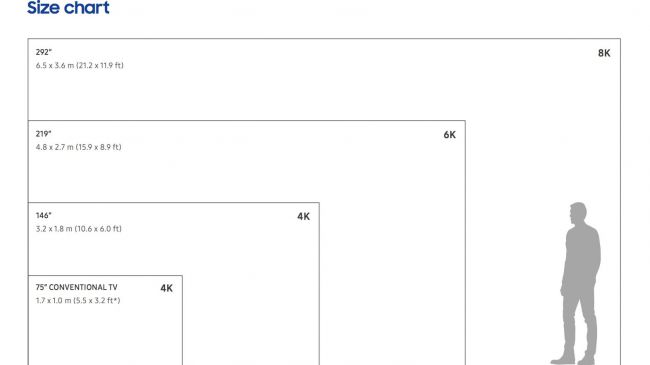 Modelul cu rezoluție Full HD are 73 inch în diagonală, cel cu rezoluție 4K este format din 16 module și diagonala atinge 146 inch. Modelele 6K și 8K urcă la 219 și 292 inch.
