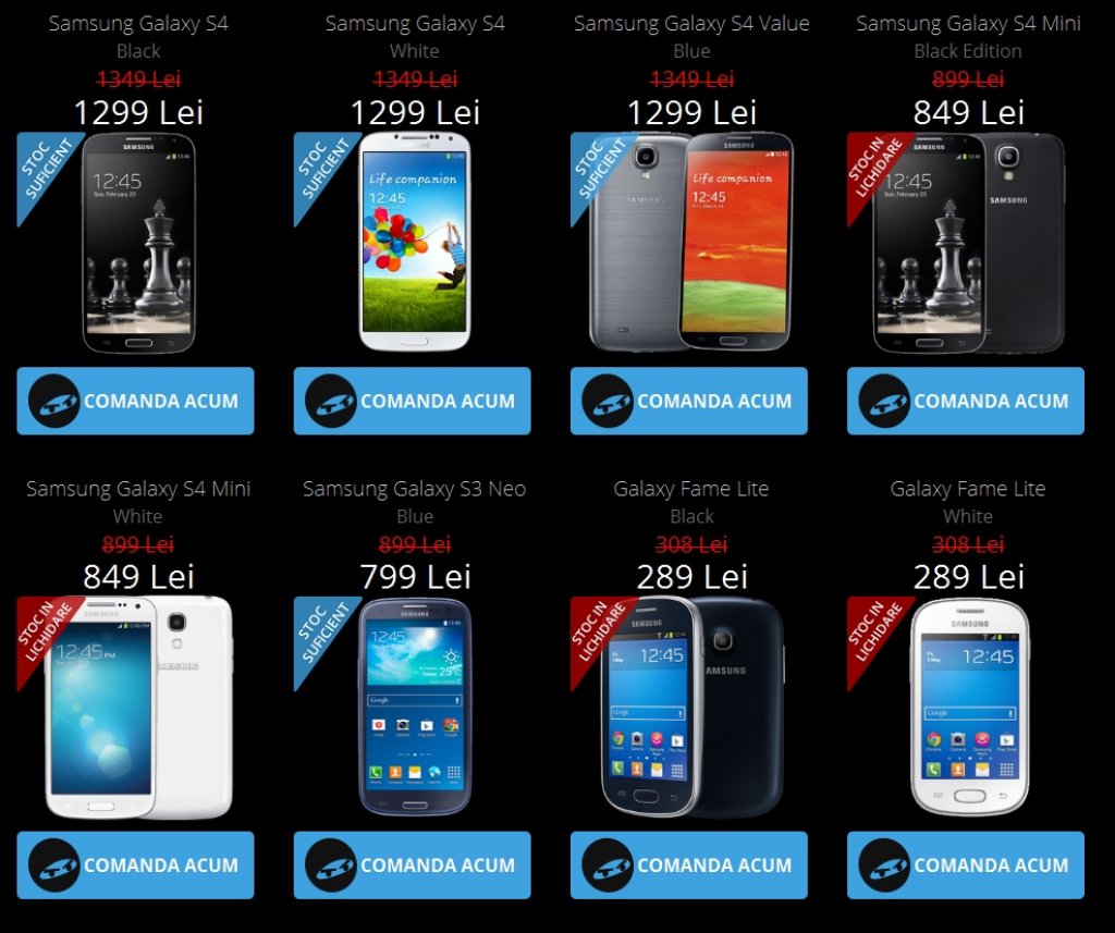 Samsung Galaxy S4 -> 1.299 lei;