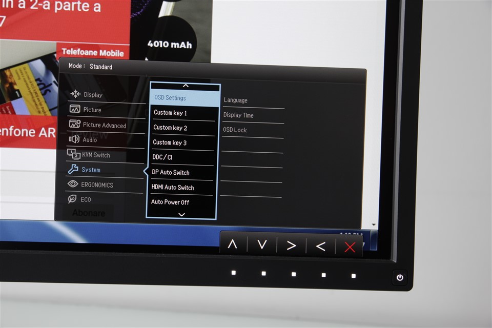 Meniul de setări al monitorului BenQ PD3200Q se accesează simplu, iar navigarea prin acesta este simplă, prin intermediul celor cinci butoane capacitive de la baza ecranului, în partea dreaptă, lângă butonul Power.