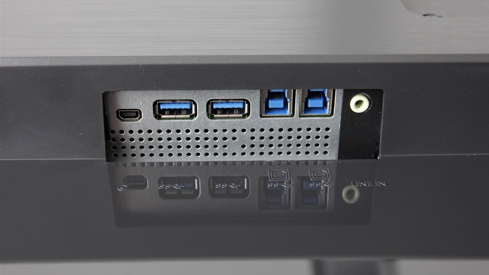 Găsim un DisplayPort 1.2, un mini DisplayPort 1.2, 1 x HDMI 1.4, 1 x DVI-DL, 4 x USB 3.0 Type A, 2 x USB 3.0 Type B, audio in prin jack de 3.5mm, ieșire audio prin jack de 3.5 mm și cititor de carduri. Acesta din urmă suportă formatele SD/SDHC/SDXC/MMC.