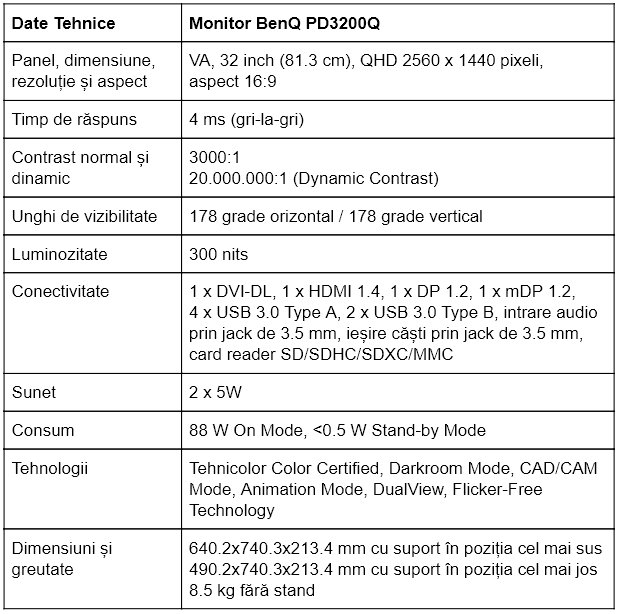 Principalele puncte pro și contra pentru monitorul BenQ PD3200Q: