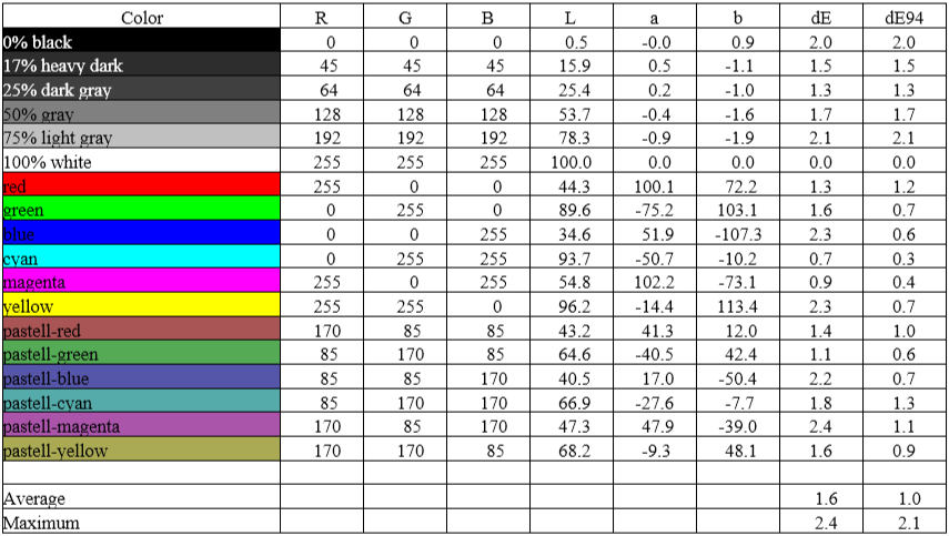 Trecem acum la culori, iar pentru a determina cât de corect sunt redate am apelat la un colorimetru și un software specializat. Înainte de a calibra monitorul am făcut un prim set de teste. Rezultatele au fost foarte bune, culorile redate cu setările din fabrică (în modul Racing din opțiunile GameVisual, care mi s-a părut cel mai natural dintre cele 8 disponibile) fiind în limita a ceea ce este considerat mai mult decât suficient. Avem un Delta E (dE) mediu de 3.1 după standardul dE94 și o deviație medie de 8.7 după standardul dE2000, cel actualizat: