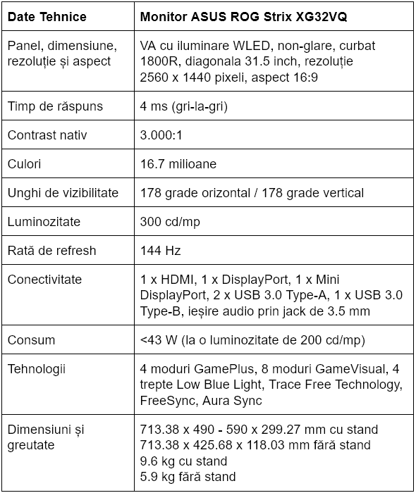 ASUS ROG Strix XG32VQ este un monitor de gaming de top, ce punctează deciziv la capitolele care contează și care nu dezamăgește mai deloc. Chiar dacă timpul de răspuns nu este cel mai scăzut, el reprezintă practic singurul compromis ce trebuie făcut spre a obține culori corecte, contrast și luminozitate înalte și unghiuri de vizualizare cât mai largi.