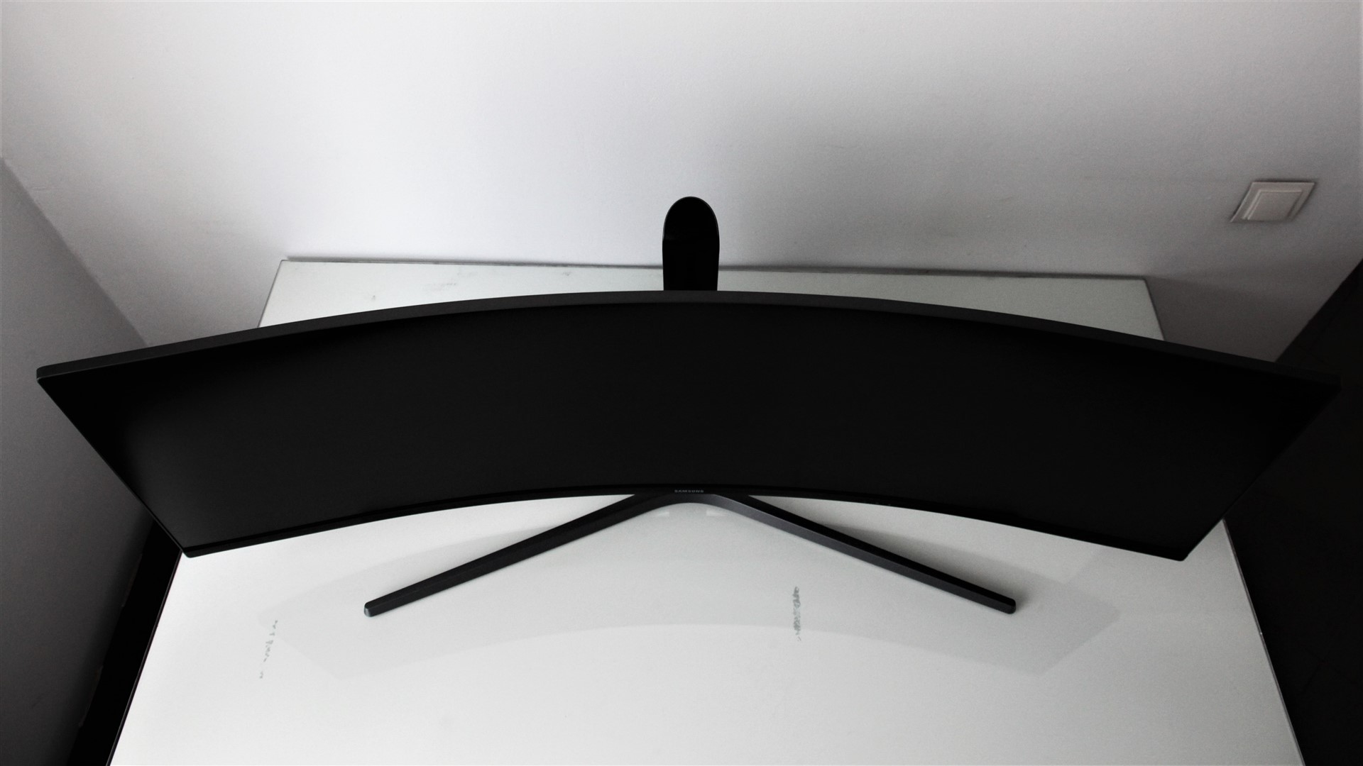 Avem în față practic două ecrane de 27 inch cu raport de 16:9 fiecare, doar că acestea sunt lipite la modul propriu unul de celălalt. Având în vedere asta, nici piciorul de sprijin nu are cum să fie micuț. Așadar pe Samsung C49HG90DMN nu-l vei putea așeza pe un micuț birou, ci va avea nevoie de spațiu. Mult spațiu.