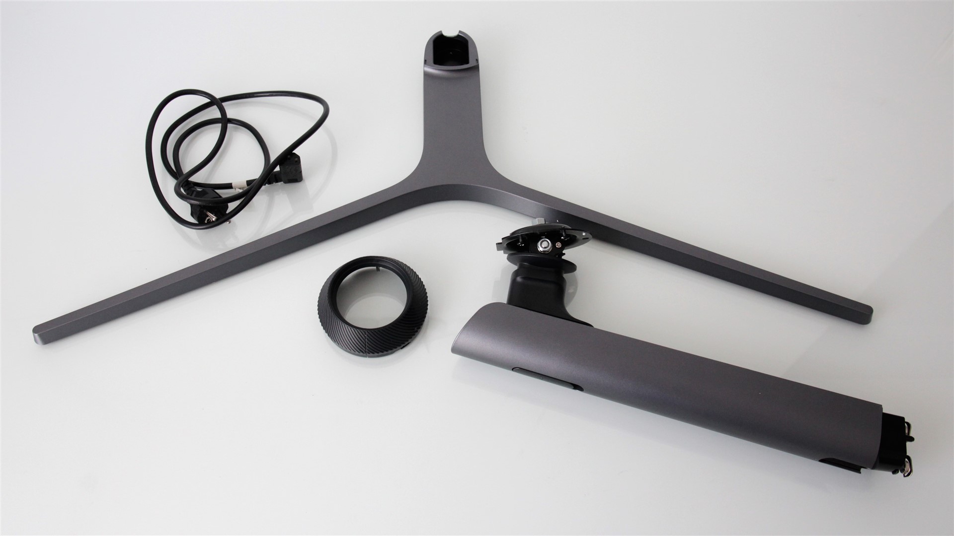 Dacă i-ai făcut loc, atunci te poți apuca să asamblezi piciorul din două segmente. Treaba asta nu-ți va lua cu totul decât câteva minute. Apoi, cu ceva forță, vei putea așeza monitorul pe masa de lucru și te mai poți minuna încă o dată de raportul de 32:9 pe care îl aduce ecranul.