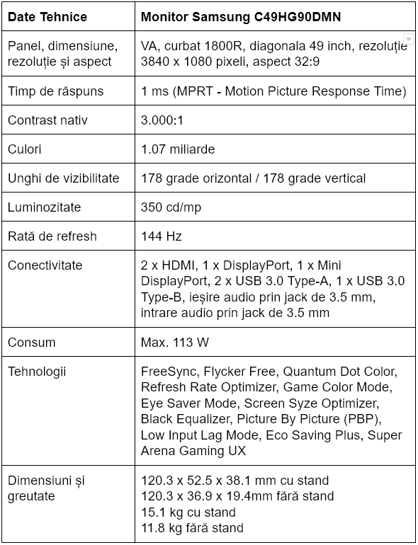 Pe Samsung C49HG90DMN îl veți găsi și sub denumirea mai scurtă CHG90. Eu mă voi referi în continuare la el sub numele lung, ceea ce contează mai puțin.