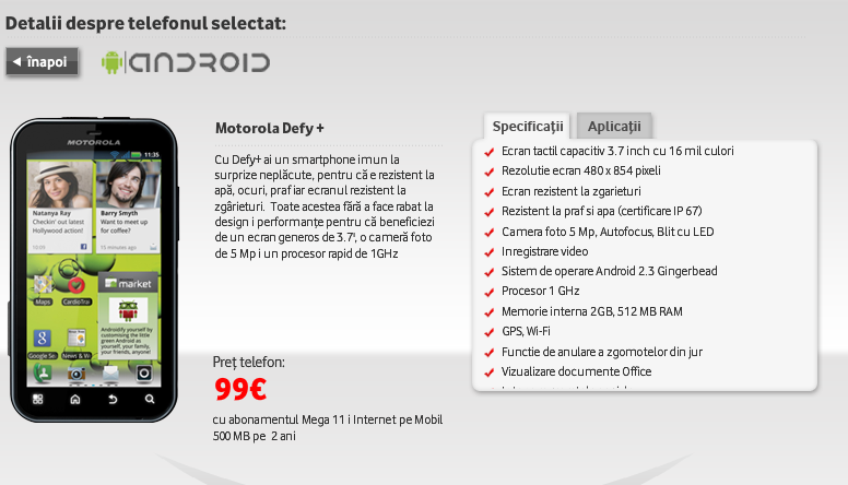 Abonamentul Mega 11 costă 11 euro pe lună şi cuprinde 125 de minute şi sms-uri naţionale, 1000 de minute şi sms-uri lunar şi 150 MB trafic de internet. Internet pe Mobil 500 MB mai aduce plata unui abonament de 7 euro pe lună. Rezultă că Motorola Defy+ costă 99 euro la un abonament cumulat lunar pe doi ani de zile de 18 euro. Traficul de internet cumulat pe lună ar fi de 650 MB.
