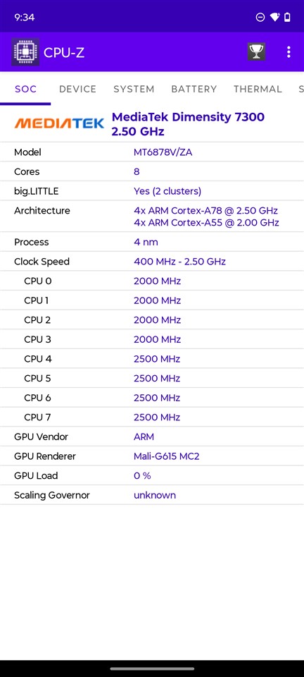 | Procesor | MediaTek Dimensity 7300 pe 4nm, octa-core cu 4 x 2.5 GHz Cortex-A78 + 4 x 2.0 GHz Cortex-A55 |