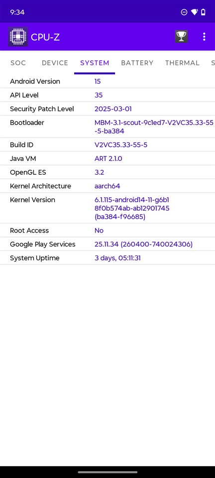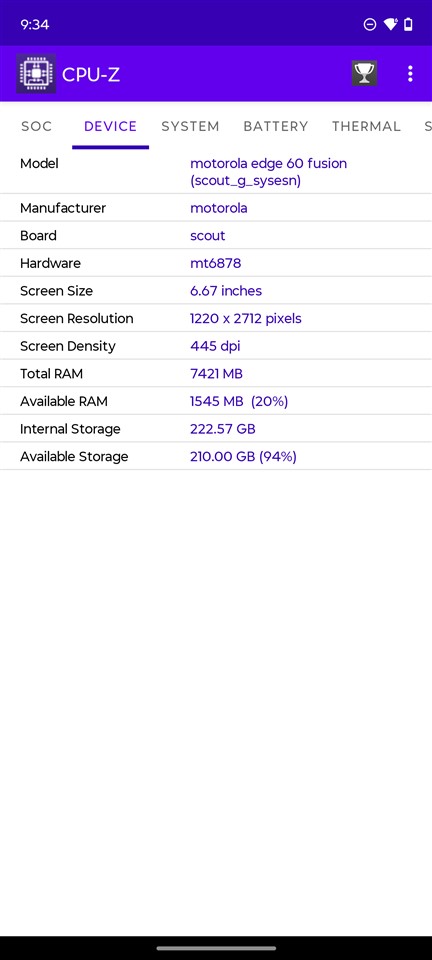 Capturi de ecran din aplicația CPU-Z cu informații despre Motorola Edge 60 Fusion: