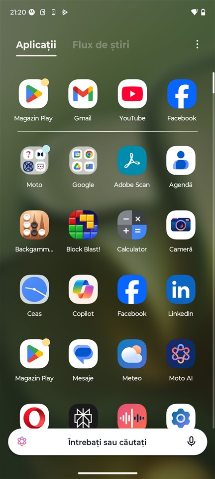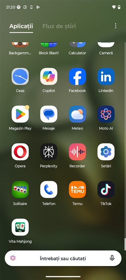 În materie de aplicații preinstalate, Motorola Edge 60 vine cu ceva cam multe, în condițiile în care în trecut, acum 3 ani să zicem, Motorola era unul dintre producătorii care nu încărcau mai deloc telefonul din fabrică. Acum sunt ceva cam multe proprii Motorola (Ajutor dispozitiv, Dolby Atmos, Family Space, Feedback, Fundaluri inteligente, Jocuri, Moto, Moto Secure, Moto Unplugged, Notificări Motorola, Notițe, Smart Connect și Moto AI) și o sumedenie de la Google, peste care mai apar Backgammon, Block Blast!, Copilot, Facebook, LinkedIn, Opera, Perplexity, Solitaire, Temu, TikTok, Vita Mahjong și Weather.
