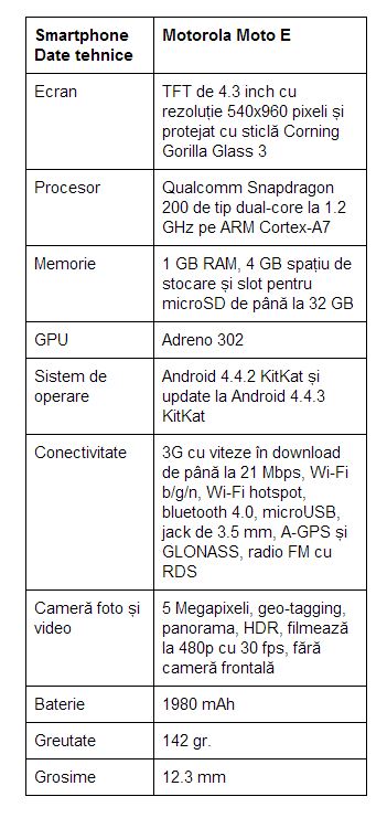 Motorola Moto E preia designul lui Moto G, adoptă un display mai mic și specificați ceva mai slabe, la un preț ce se dorește a fi imbatabil. Peste toate acestea se adaugă Android 4.4 în stadiu nativ, fără vreo modificare la nivel de UI, exact ca OS-ul portat pe telefoanele din gama Nexus sau în ediție Google Play.