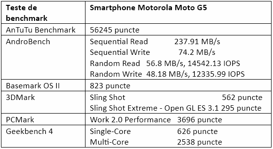 Rezultatele tuturor testelor de benchmark rulate de Motorola Moto G5 sunt trecute în tabelul de mai jos.