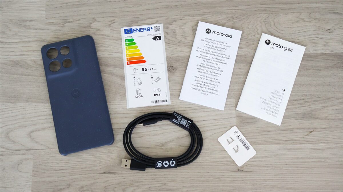 Motorola Moto G86 5G vine în pachet alături de o husă, cablu USB-C la USB-A, agrafă pentru acces la slotul SIM și mai multe pliante, cu informații diverse.