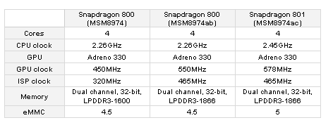 Procesorul Snapdragon 801 oferă 4G LTE Cat4 integrat, procesor grafic Adreno 330 şi un CPU Krait 400 quad-core. De asemenea, acesta oferă cu 14% mai multă performanţă decât Snapdragon 800, putere grafică cu până la 28% mai rapidă şi viteză de captură foto cu până la 45% mai rapidă decât acelaşi Snapdragon 800. Raportat la un procesor din 2012, Snapdragon S4 Pro (procesor existent pe smartphone-uri gen Google Nexus 4 sau LG Optimus G), Snapdragon 801 este cu 75% mai puternic decât acesta.