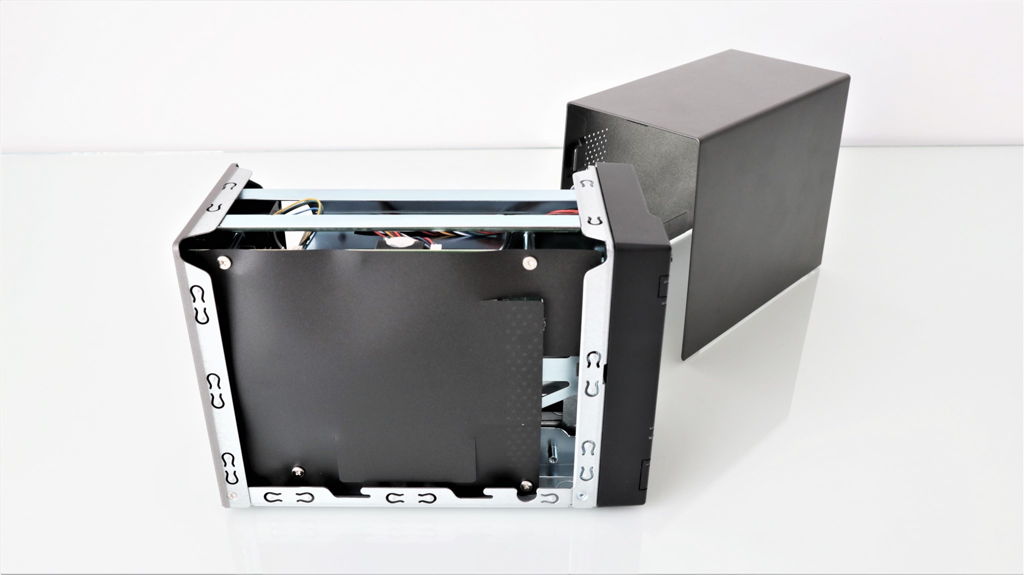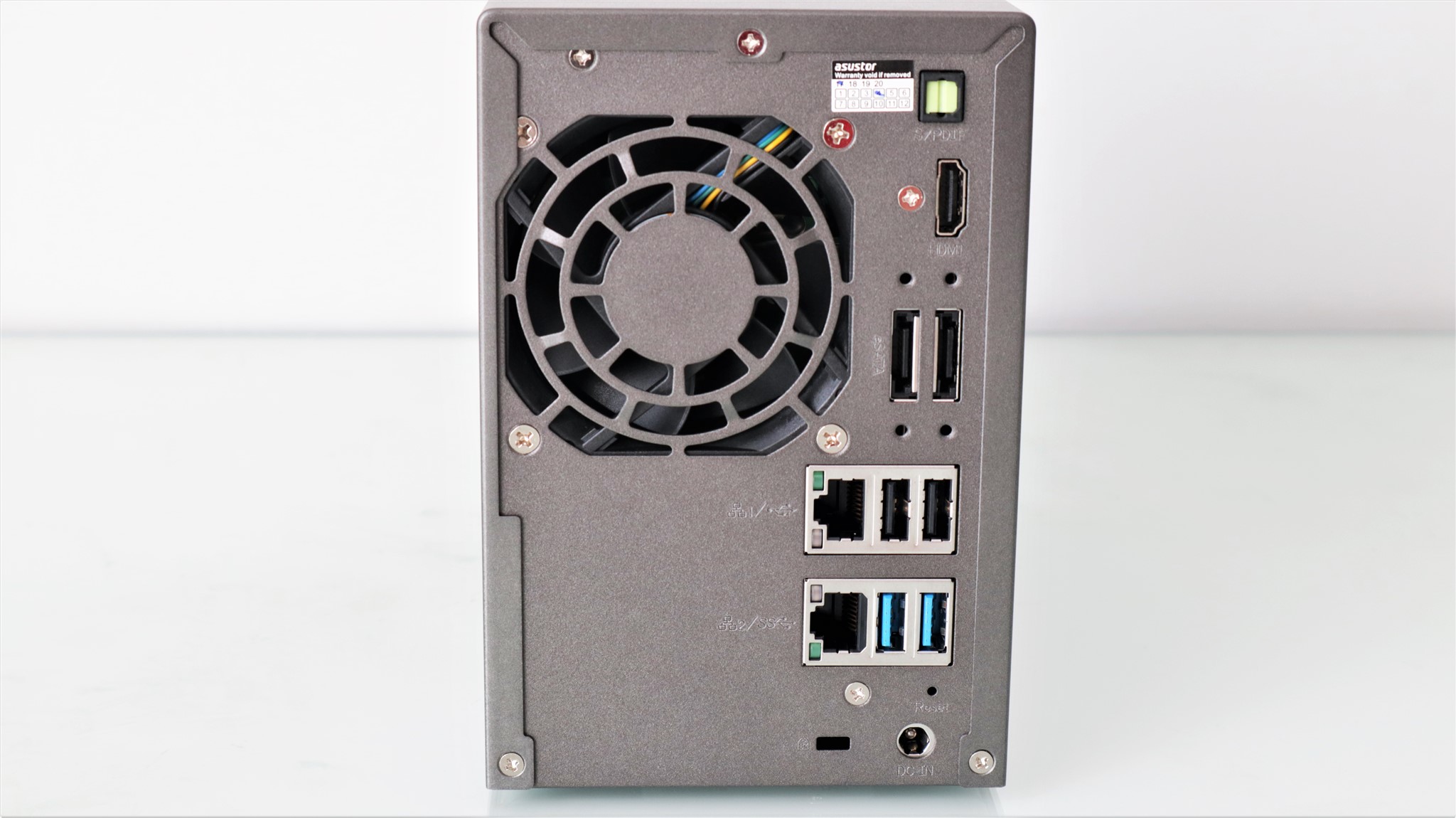Doar una dintre lateralele dispozitivului este prevăzută cu fante de aerisire, fiind vorba despre cea din stânga. Orificiile sunt grupate în dreptul plăcii de bază a NAS-ului, acolo unde se va aduna destulă căldură în timpul funcționării. Ventilatorul de 70 mm de pe spate ajută și el la menținerea unei temperaturi scăzute în interior. Tot pe spate sunt și mai toate elementele de conectivitate.