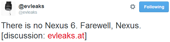 Zvonurile că programul Nexus al celor de la Google se va încheia sunt din ce în ce mai puternice, iar ultimele informaţii venite de la @evleaks spun că nu va mai exista nici măcar Google Nexus 6 anul acesta.