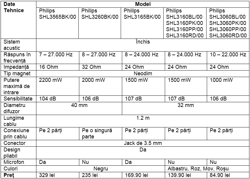 Am structurat în tabelul de mai jos principalele caracteristici pentru noua gamă de căști Philips DJ Style precum și prețul recomandat pentru fiecare model:
