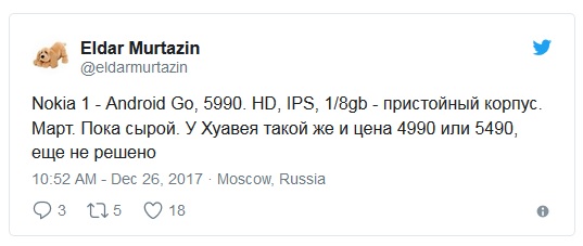 Se pare că unul dintre primele smartphone-uri cu Android Go va fi Nokia 1. Telefonul ar urma să fie lansat în luna martie a anului viitor şi va fi comercializat în special în ţările aflate în curs de dezvoltare. Printre specificaţiile posibile regăsim:
