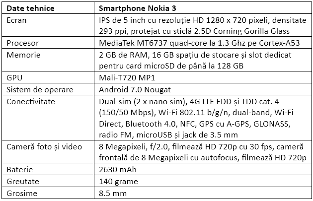 Nokia 3 reprezintă pentru moment smartphone-ul entry level al companiei. Pentru a nu mai lungi inutil recenzia, eu zic să trecem la ceea ce contează cu adevărat. Prima oară vedem caracteristicile principale.