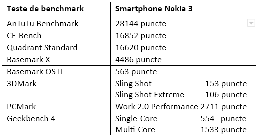 Nokia 3 a trecut și prin câteva teste de benchmark. Rezultatele relevă performanțe modeste, însă asta nu înseamnă neapărat o experiență de utilizare asemenea, după cum am explicat deja ceva mai sus. Tabelul următor cuprinde toate rezultatele testelor de benchmark la care a fost supus Nokia 3: