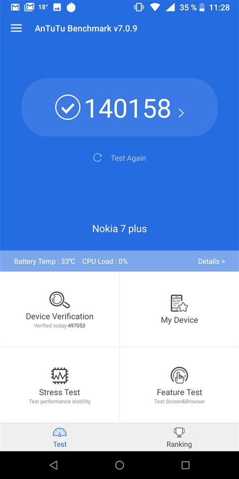 În testul nostru, când rulăm continuu playlist-ul Unboxing de pe canalul Gadget.ro de pe YouTube, cu luminozitatea ecranului la maximum, prin conexiune Wi-Fi la internet, Nokia 7 Plus nu pot spune că a impresionat. Bateria plină a ajuns la 10% după 7 ore și 22 de minute. Un rezultat bun, dar nu excelent, așa cum se dovedește de fapt autonomia reală a unui Nokia 7 Plus.
