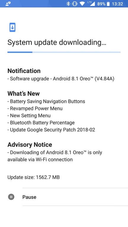 Actualizarea V4.84A aduce mici îmbunătăţiri de ordin estetic, cât şi update-ul de securitate februarie 2018. Noua versiune Android 8.1 Oreo are o dimensiune de 1562.7 MB şi poate fi instalată doar prin conectivitate Wi-Fi.