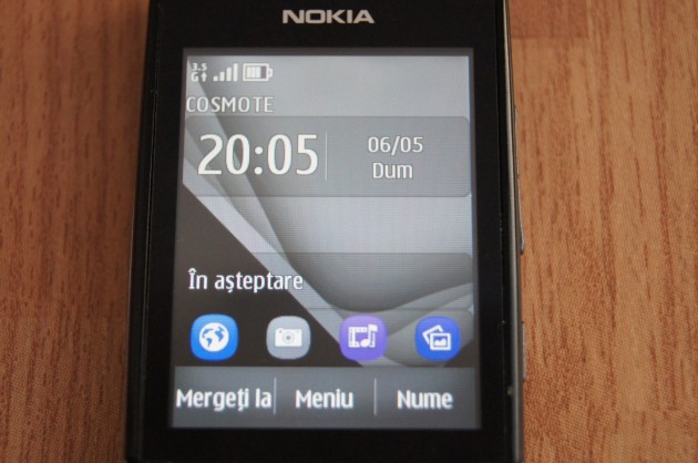 Series 40 mizează ca și întreg acest telefon pe simplitate în utilizare. Bootează repede, dacă se poate spune așa. Ca să deblochezi ecranul trebuie să apeși tastat dedicată pentru încheierea apelurilor și un gest swipe pe display de la stânga la dreapta. Sunt patru icoane cu rol de scurtătură către browser, camera foto, galerie cu fotografiile, clipurile video și alte fișiere de pe telefon și un alt icon pentru galeria foto propriu-zisă. Sub aceste 4 icon-uri se află o bară pe care găsești un shortcut către personalizarea sau activarea a diverse funcții, acces la meniu și către agendă.