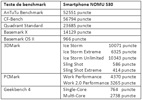 L-am trecut și pe NOMU S30 prin mai multe teste de benchmark, iar rezultatele le puteți analiza mai jos, în tabel: