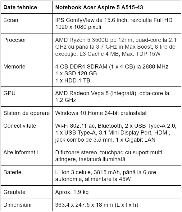 Modelul testat nu corespunde 100% ca specificații cu niciunul dintre modelele Acer Aspire 5 de pe site-ul oficial, asta fiindcă în cazul de față este vorba despre un exemplar de test, unul de pre-producție. Diferențele stau în dreptul memoriei RAM, de doar 4 GB față de 8 GB la tot ce am găsit, și la spațiul de stocare, format aici dintr-un SSD de 120 GB și de un HDD de 1 TB, față de un SSD de 512 GB la modelele de serie.
