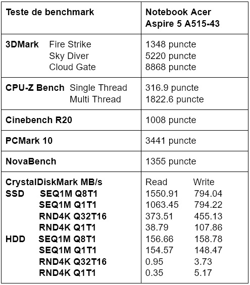 Sunt convins că dacă memoria RAM ar fi fost de 8 GB și în cazul exemplarului ajuns la noi, Acer Aspire 5 A515-43 s-ar fi descurcat mai bine în multitasking și s-ar fi simțit mai rapid la modul subiectiv, cu toate că în testele de benchmark nu s-ar fi văzut mari diferențe de scor, cel mai probabil.