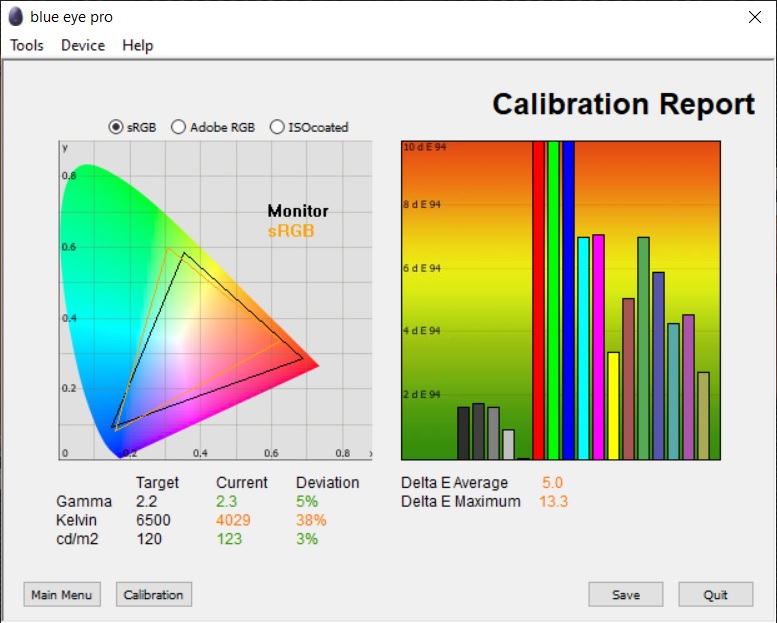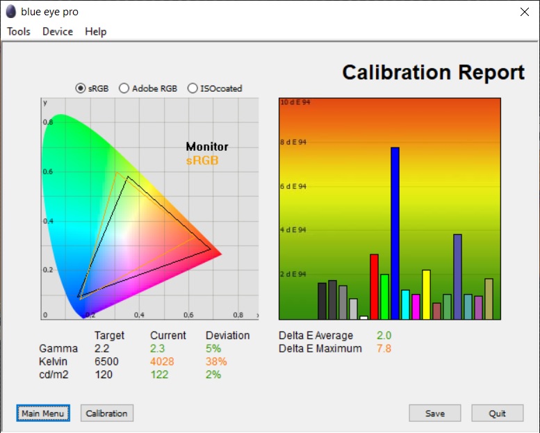 După calibrare, deviațiile au scăzut considerabil, fiind vorba despre un Delta E mediu de doar 0.4 și 0.6, pentru Delta E94, respectiv Delta E2000. Deviațiile maxime au fost de 1.4 și 1.7, după aceleași standarde.