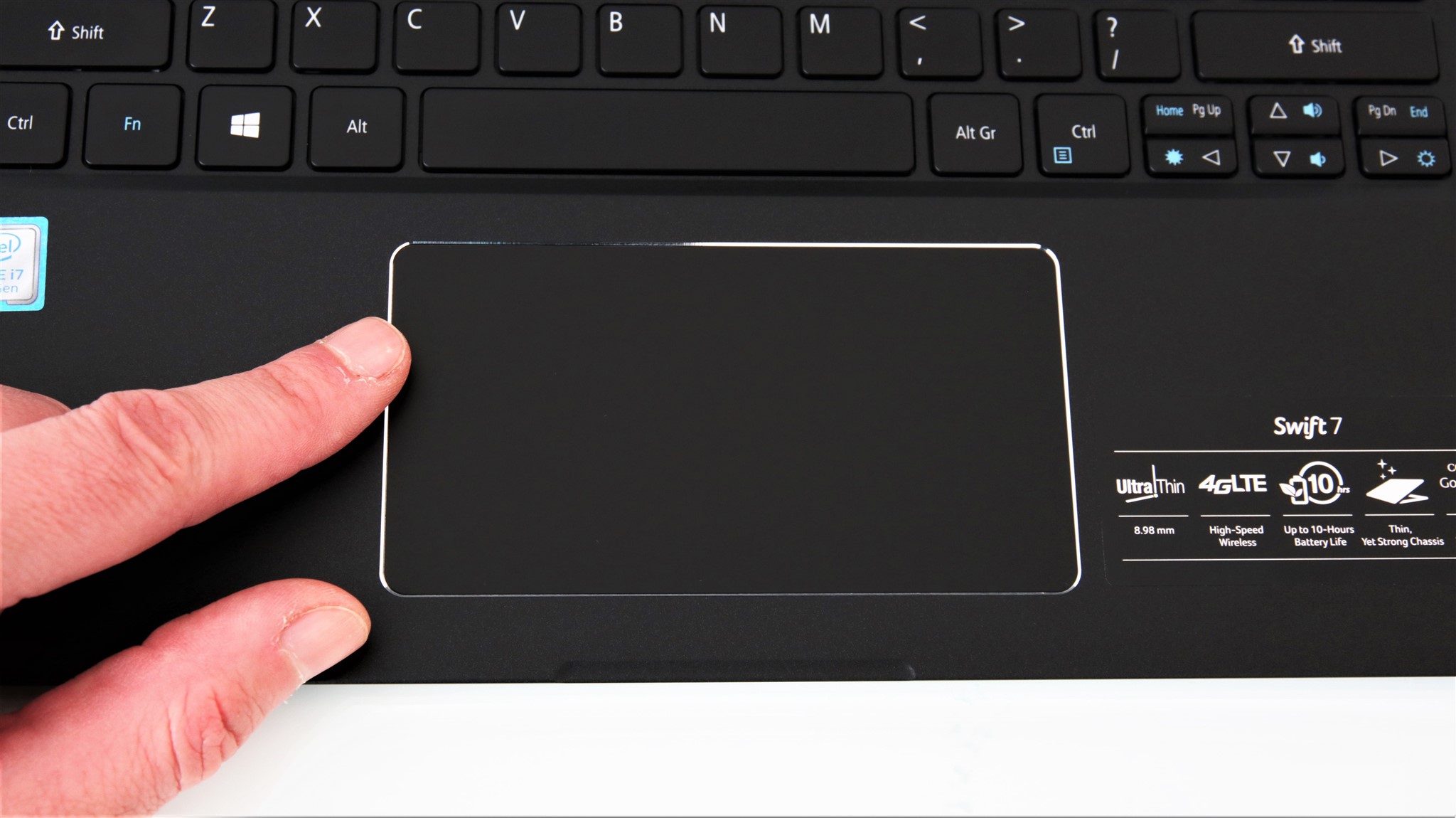 Tastatura de pe Acer Swift 7 aduce butoane de dimensiuni normale, nu mi s-au părut a fi mai mici decât pe o tastatură convențională de desktop. Tastele sunt delimitate între ele de un spațiu optim. Cursa este foarte, dar foarte scurtă. Nici nu cred că avea cum să fie fizic altfel, dată fiind, din nou, grosimea acestui laptop. Necesită ceva timp de obișnuință această tastaură, fiindcă nu primești cel mai bun feedback la apăsare.