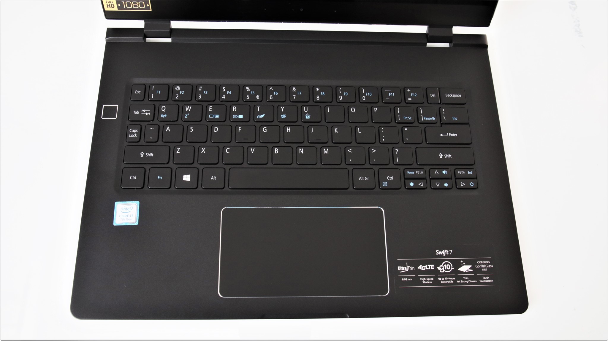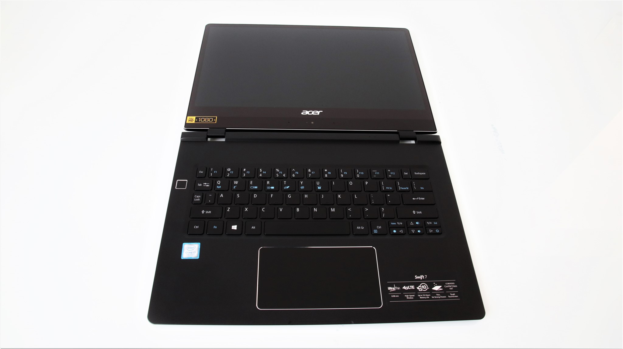 Ecranul lui Acer Swift 7 este unul de 14 inch de tip IPS, cu rezoluție Full HD 1920 x 1080 pixeli. Avem o densitate de circa 157 ppi, ce reușește să contureze clar și cele mai mici detalii, fonturi. Display-ul suportă atingeri multiple și este protejat la zgârieturi și șocuri ușoare cu Corning Gorilla Glass. Este de tip Glossy și aici ar fi primul punct contra. Suprafața ecranului reflectă excesiv mediul ambiant, destul de greu să folosești acest laptop în lumină naturală, dar chiar și înăuntru când lumina vine către display.