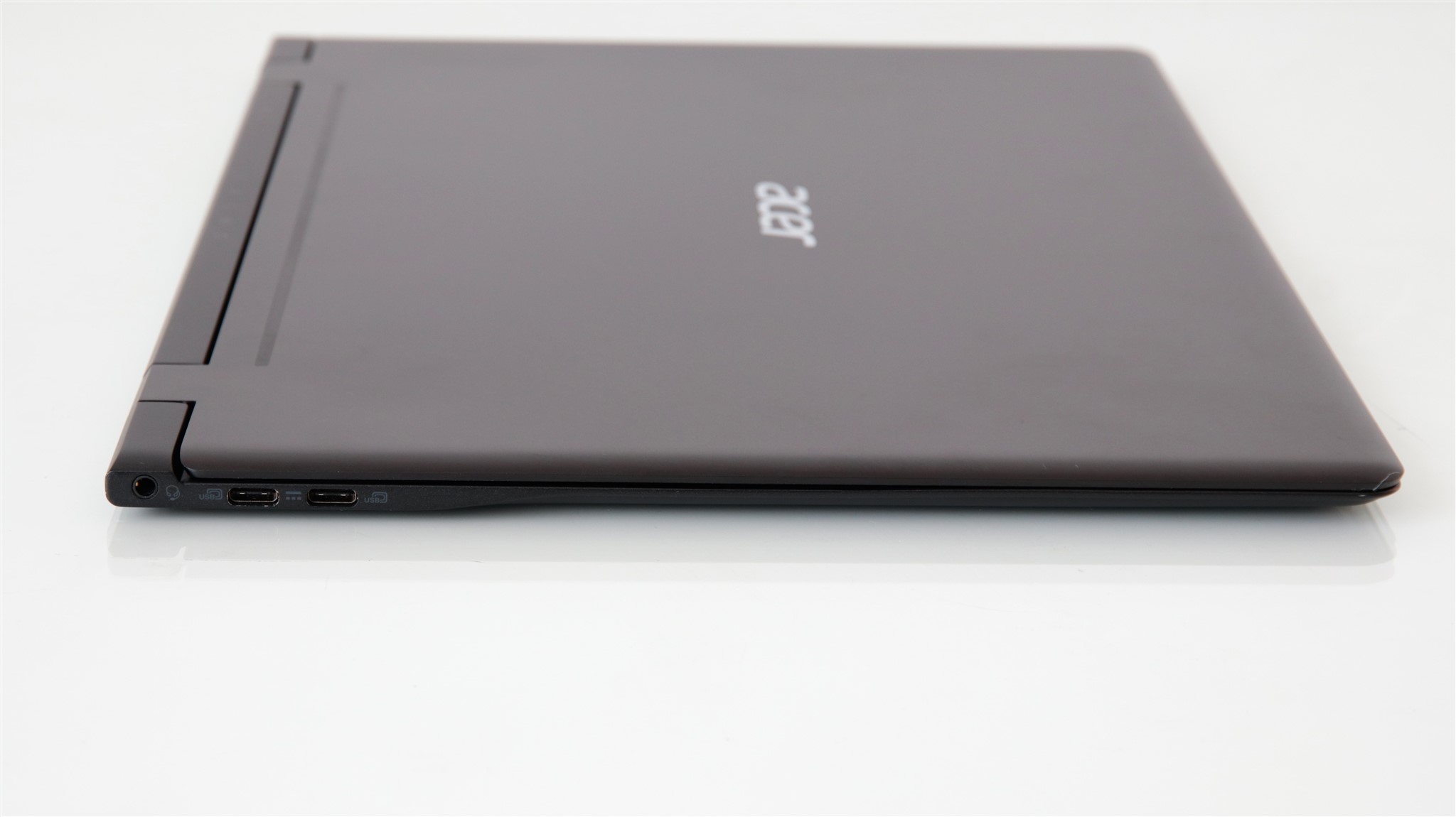 Acer Swift 7 are două colțuri rotunjite și două la unghi drept (cele de pe latura cu balamalele). Logo-ul Acer este pe partea superioară, în timp ce pe bază vedem patru piciorușe din cauciuc și grilele pentru cele două difuzoare.