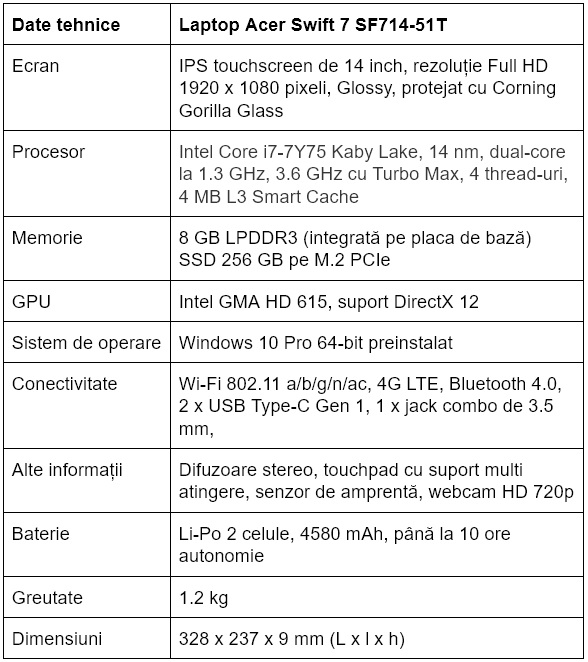 Acer Swift 7 SF714-51T – 6.500 de lei pe eMAG.ro (cu reducere la data publicării review-ului) sau 7.500 de lei pe PCgarage.ro.