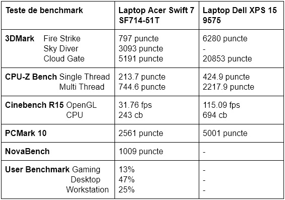 Am rulat câteva teste de benchmark, iar rezultatele le-am structurat în tabelul de mai jos. Am pus alături și rezultatele obținute de modelul Dell XPS 15 testat de Emil acum două luni, spre comparație: