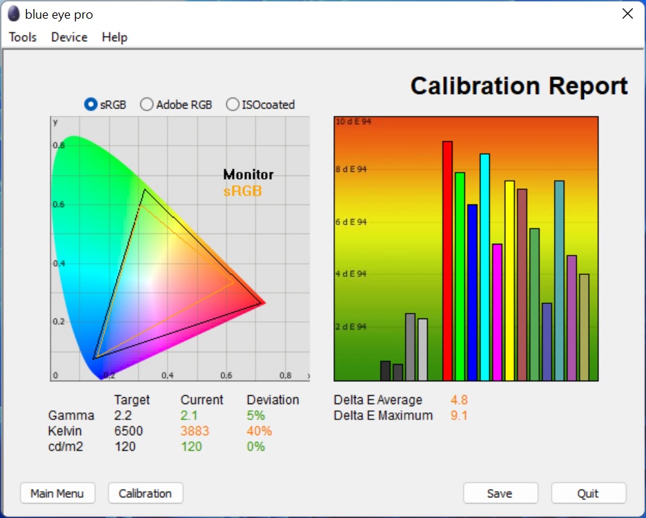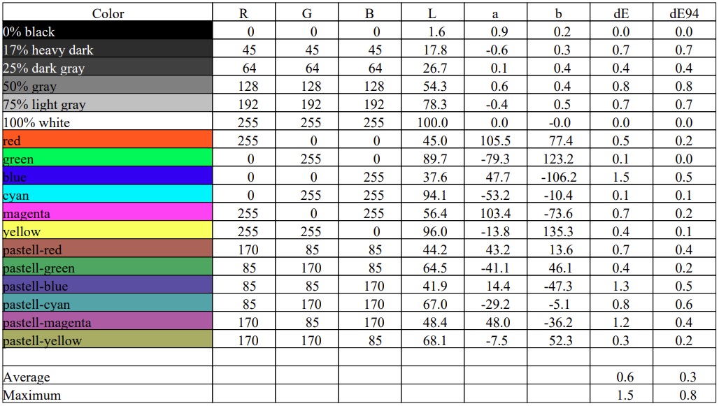 La prima vedere, ecranul arată culori plăcute, intense, dar nu exagerat. Iată cum arată deviațiile Delta E înainte și după calibrarea ecranului: