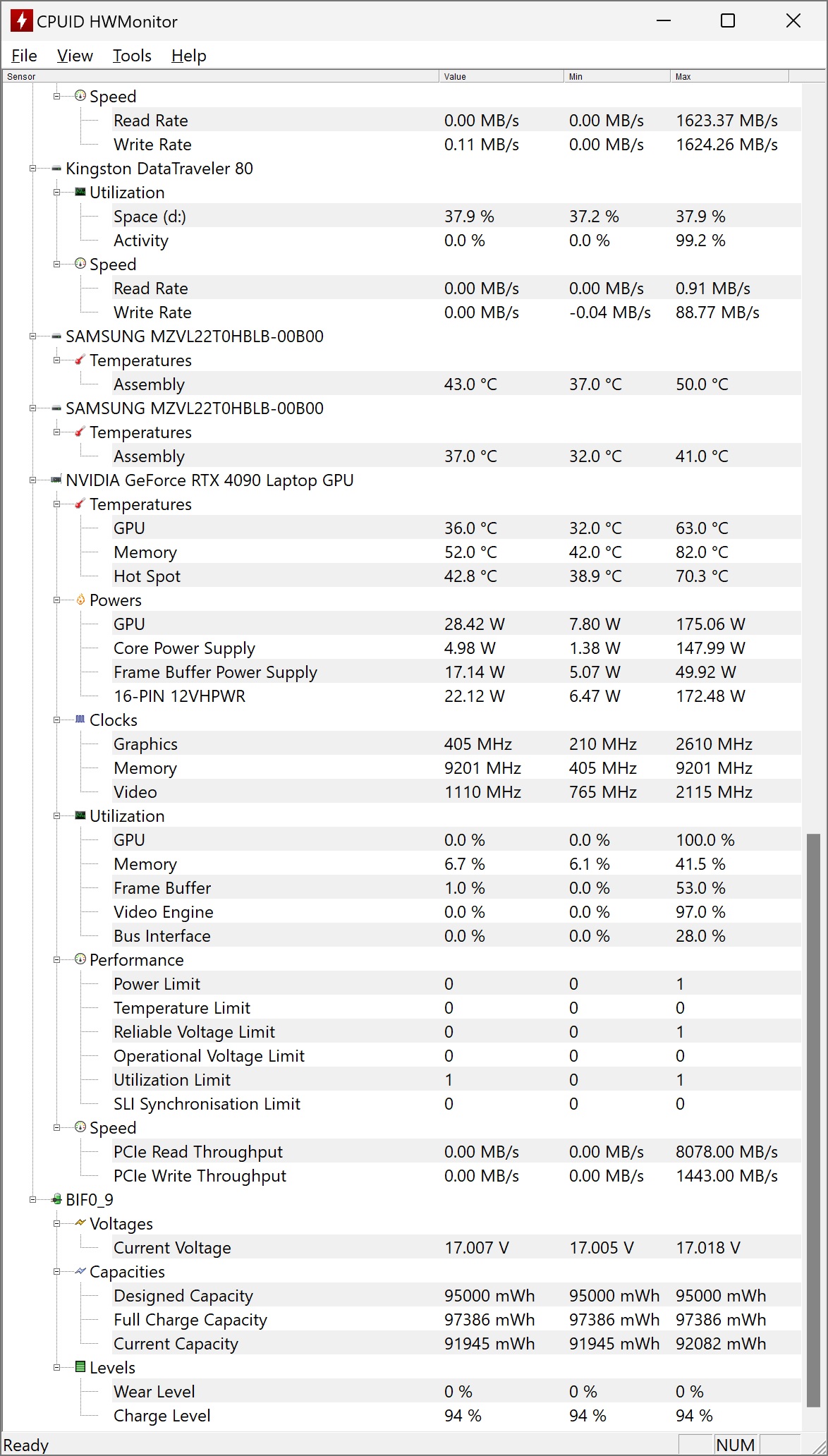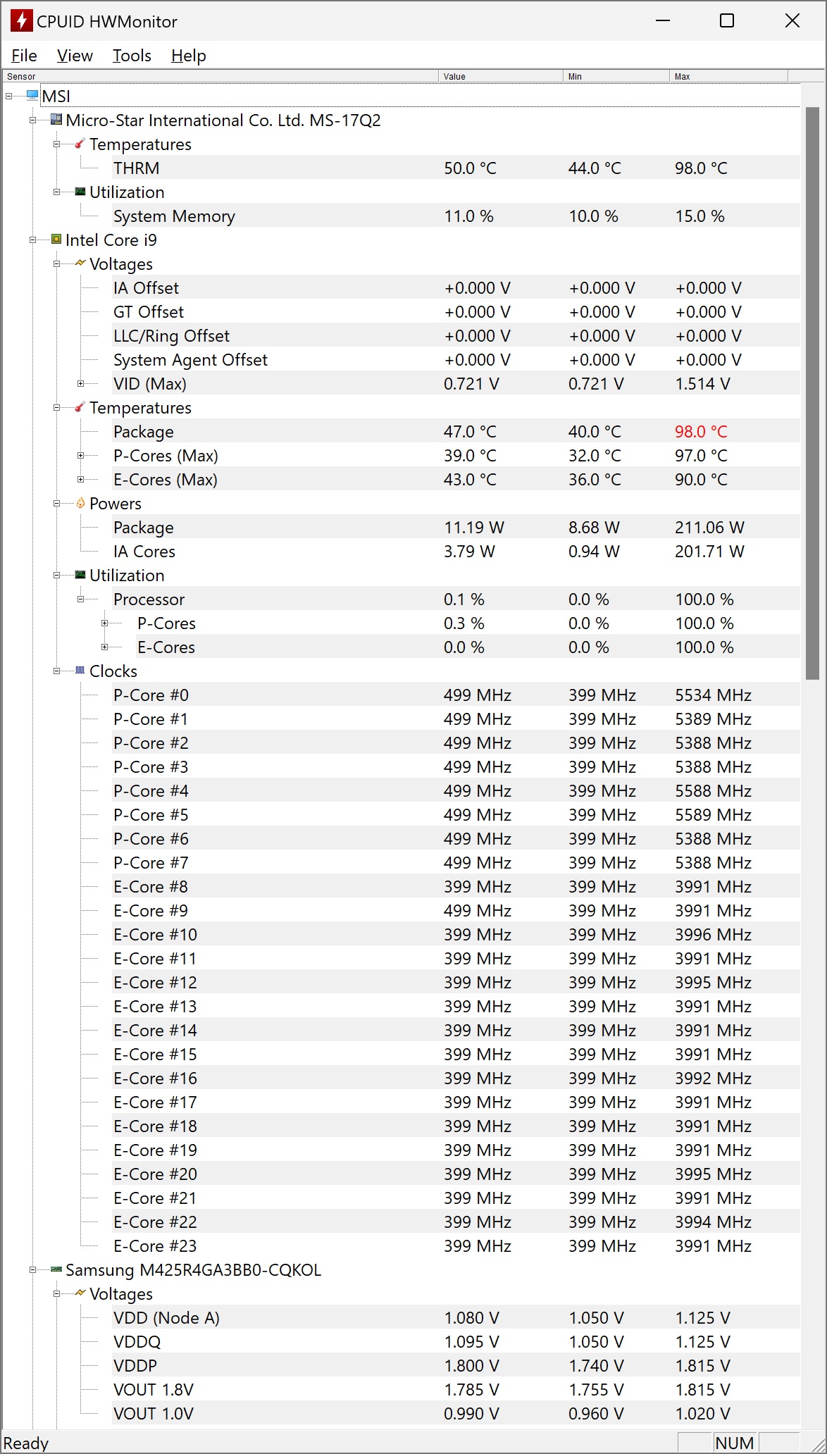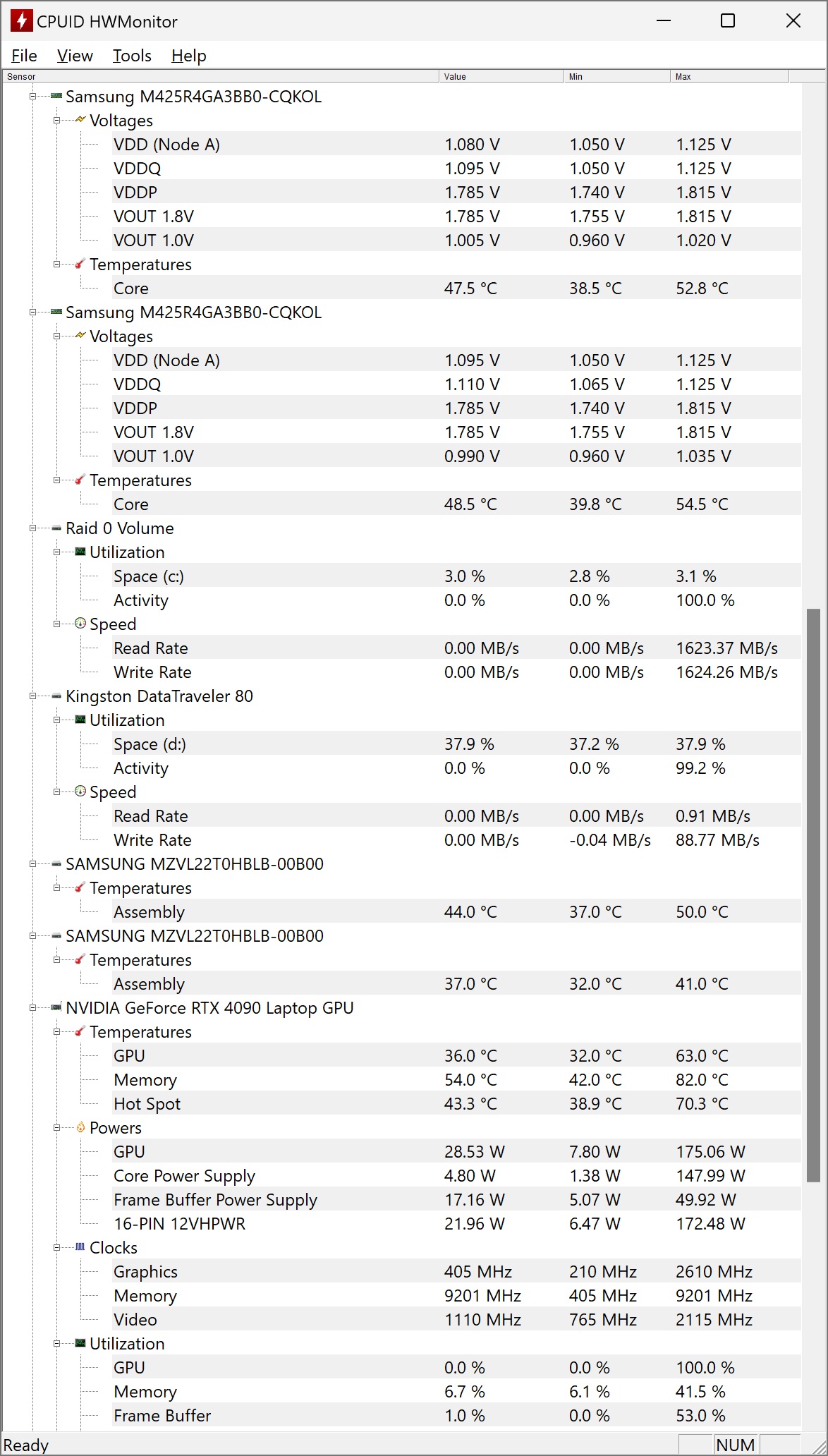 Ca de obicei, am monitorizat temperaturile pe componentele interne, iar rezultatele pot fi observate din capturile de ecran de mai jos, din HWMonitor de la CPU-ID: