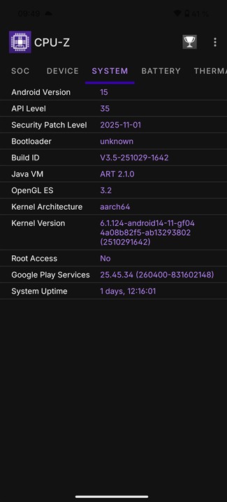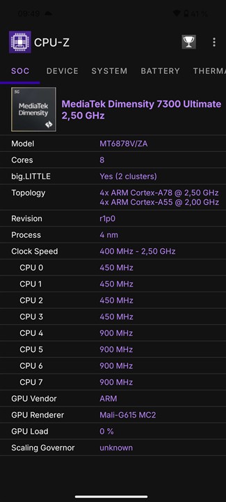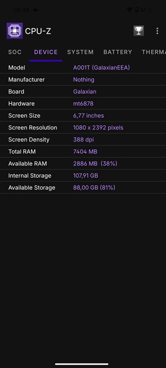 Capturi de ecran din aplicația CPU-Z cu informații despre Nothing Phone (3a) Lite: