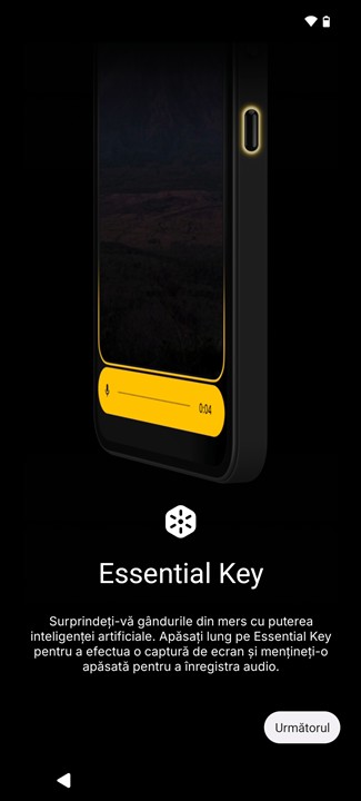Elementele fizice de conectivitate și interacțiune sunt poziționate astfel: jos avem portul USB-C, slotul pentru cartele SIM și card de memorie microSD, difuzorul multimedia și microfonul principal; pe stânga apar butoanele pentru reglarea volumului; sus este un microfon secundar, în timp ce pe laterala din dreapta avem butonul Power și Essential Key. Acesta din urmă îți permite acces rapid la Essential Space sau poate primi o altă funcție, dar este foarte deranjant unde este amplasat. Este prea aproape de butonul Power și astfel de foarte multe ori am apăsat Essential Key în loc de Power. Este adevărat că dimensiunile celor două butoane, dar și forma și textura lor sunt diferite, dar chiar și așa le vei tot apăsa pe unul în locul celuilalt. Destul de enervant a fost pentru mine.