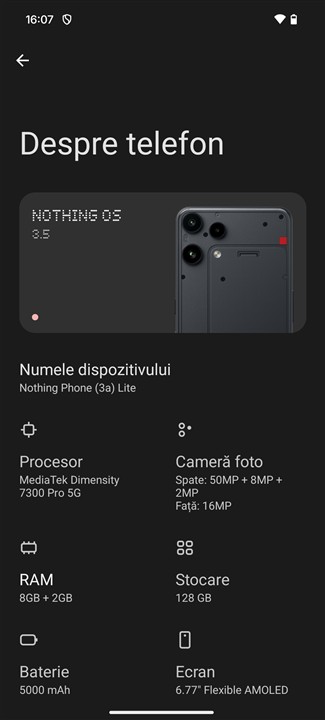 Aici, Nothing Phone (3a) Lite nu iese în evidență prin ceva anume, iar aici mă refer mai ales pe zona de conectivitate fără fir. Avem ceea ce este normal și firesc în acest segment de preț.