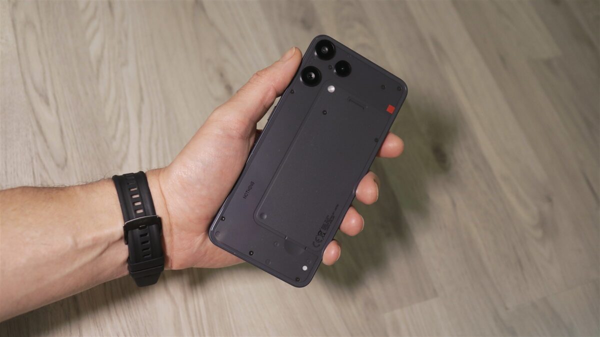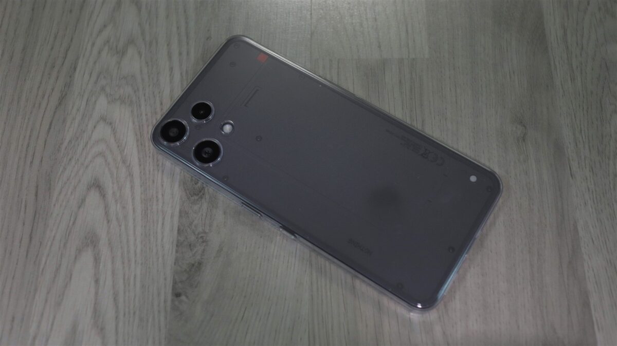 Versiunea de față este cea în culoarea neagră, Nothing Phone (3a) Lite mai poate fi ales și pe alb. Bine, nu este vorba neapărat chiar de negru, ci mai degrabă de un gri închis. Spatele este de fapt transparent la exterior, lăsând să se vadă cumva câte ceva de sub carcasă. Nu-i însă vorba fix despre asta, ci mai degrabă despre un aranjament de design, deși sunt vizibile și ceva șuruburi.