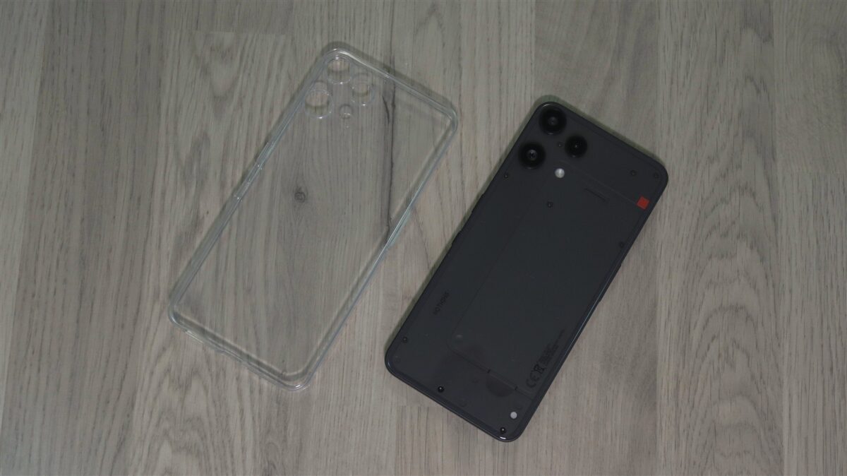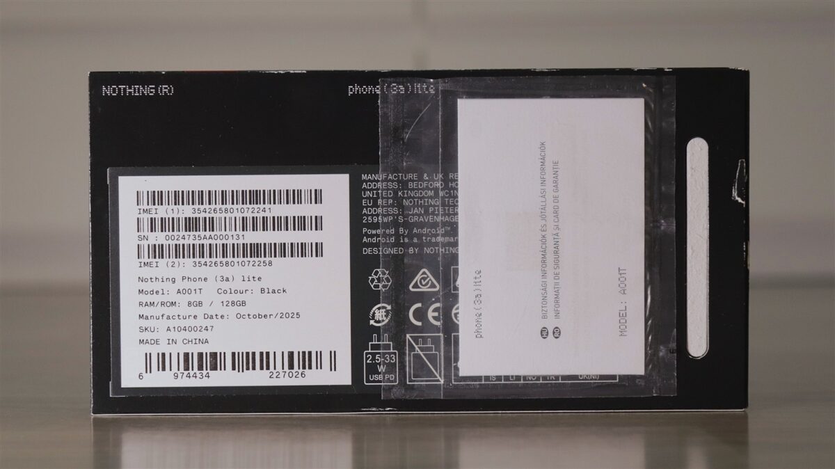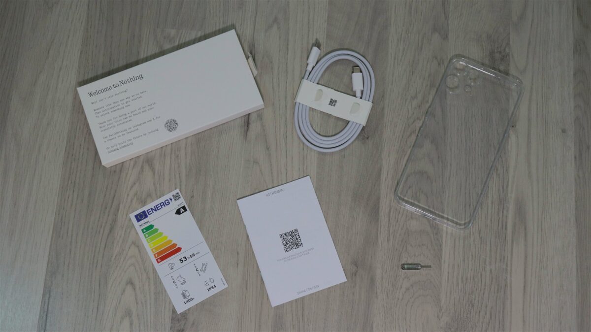 Am primit unitatea de test în cutia de retail sigilată, în care, pe lângă telefon, mai avem o husă din silicon transparent, o agrafă pentru acces la slotul SIM cu un design mai special, un cablu USB-C la ambele capete, un ghid de pornire rapidă și un sticker devenit obligatoriu prin lege, cu diferite informații (consum de energie, rezistență la șocuri, grad de reparabilitate etc).