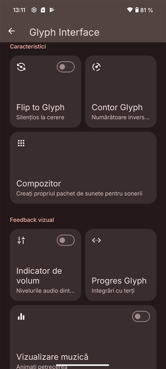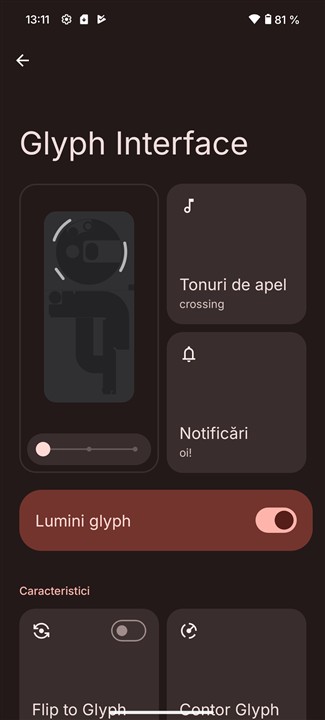 Opțiunile sunt foarte extinse, de la notificări pentru care să se aprindă în anumite feluri, la persoane din agendă pentru care să setezi un anumit joc de lumini, la aprindere în ritmul soneriei de apel sau al melodiei pe care o asculți și până la a folosi aceste LED-uri pe post de lanternă sau de flash pentru cameră, când Glyph poate susține iluminarea de unul singur sau poate ajuta LED flash-ul din modulul circular cu camerele de pe spate.