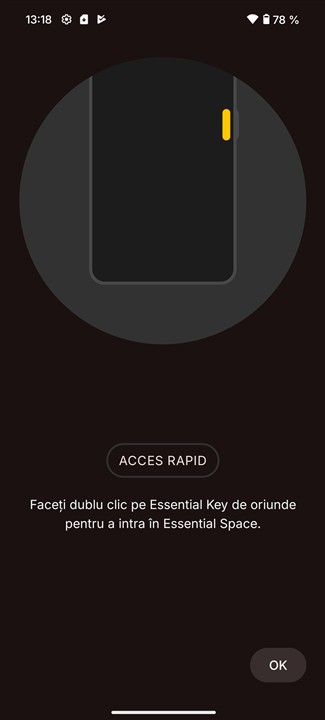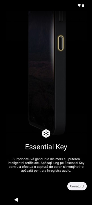 Acest al doilea buton este mai mic, mai rotunjit și este lucios. Cumva s-au făcut eforturi spre a-l simți mai altfel și spre a nu-l confunda cu butonul Power. Acest buton este personalizabil, adică poate îndeplini funcții diverse, la o singură apăsare, la una dublă sau la una prelungită. În mod standard, la o apăsare dublă deschide instant aplicația Essential Space, dar poți modifica asta.