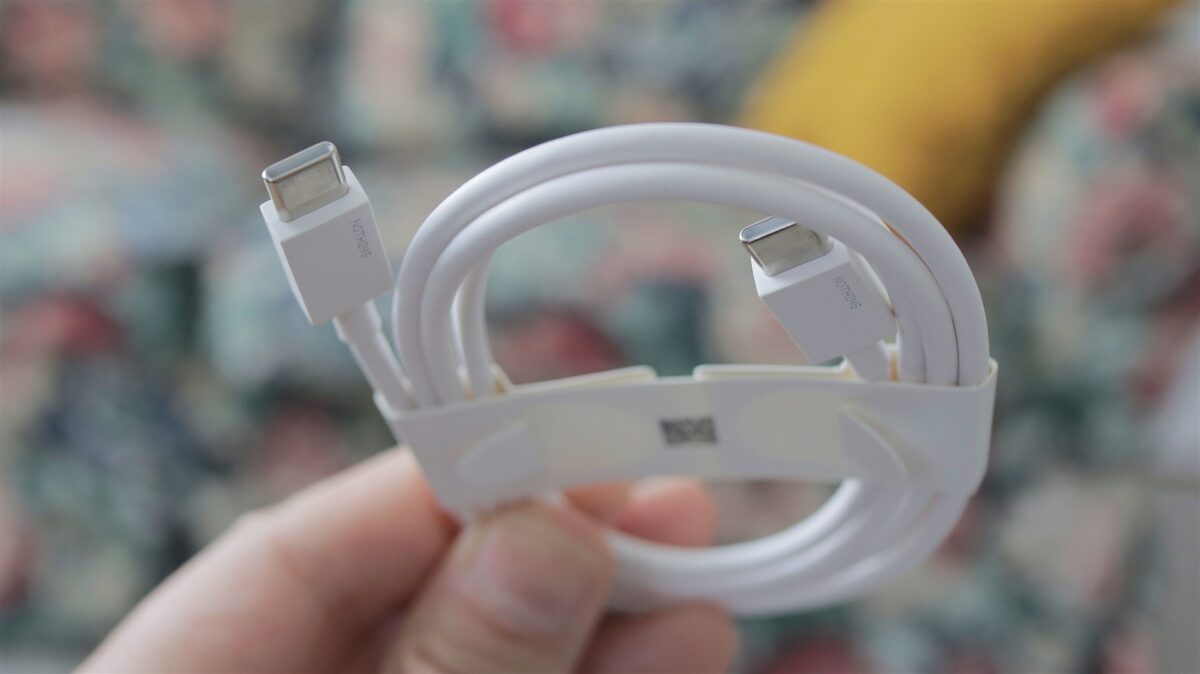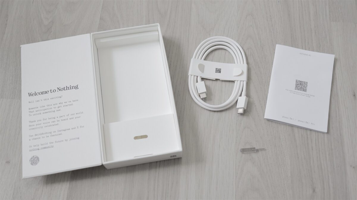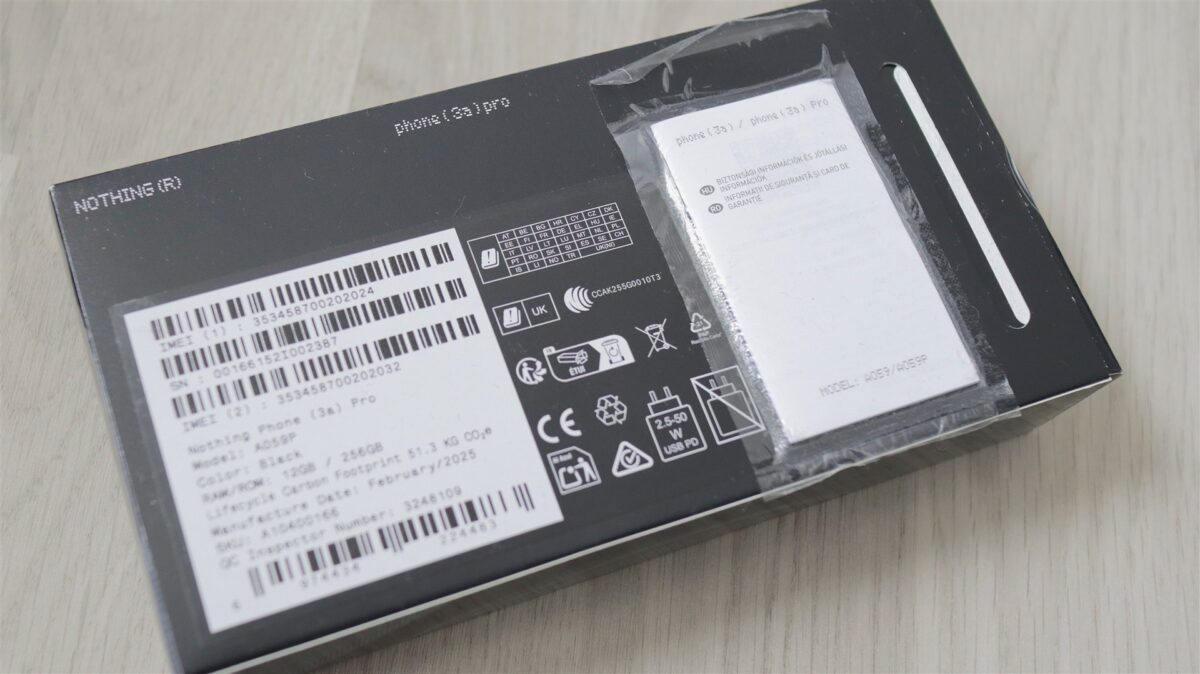 Am primit exemplarul de test în cutia de retail, în care, pe lângă smartphone-ul propriu-zis în culoarea neagră (mai există și gri), am mai găsit un cablu cu mufe USB-C la ambele capete, o agrafă pentru acces la slotul SIM, una cu un design deosebit, și un ghid de pornire rapidă. Un pliant cu alte informații este lipit într-o punguță pe exteriorul cutiei, pe spatele acesteia.