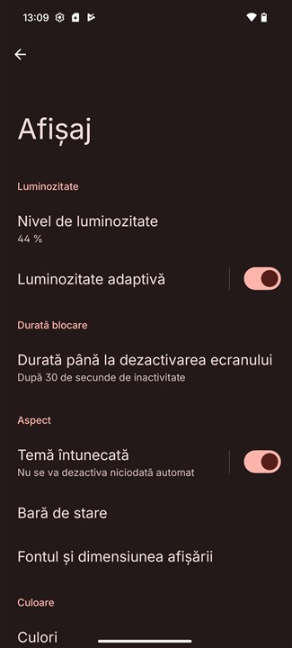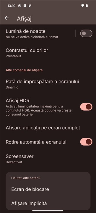 Capturi de ecran din meniul cu setări ale afișajului de pe Nothing Phone (3a) Pro: