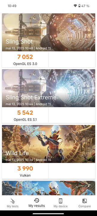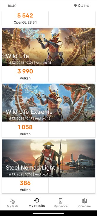 | 3DMark Wild Life Vulkan Wild Life Extreme Vulkan Sling Shot OpenGL ES 3.0 Sling Shot Extreme OpenGL ES 3.1 Steel Nomad Light Vulkan | 3990 puncte 1058 puncte 7052 puncte 5542 386 puncte |